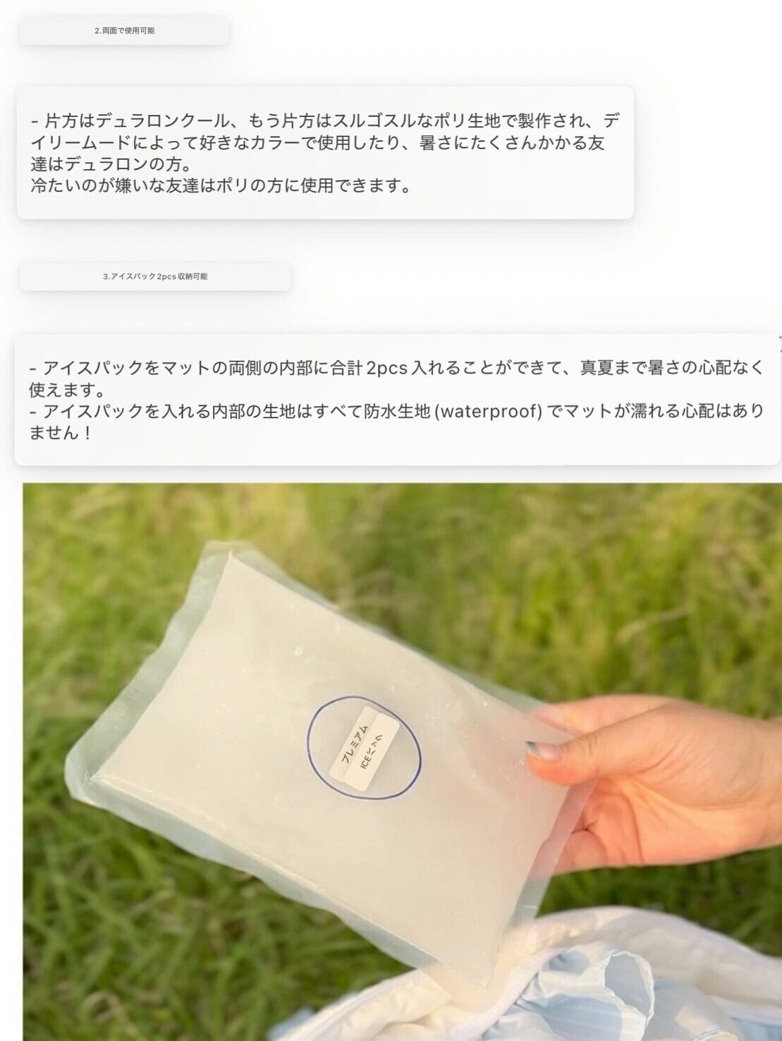 欲しいアイスマットは、 持ち運びができること、アイスパックも入れられること!!