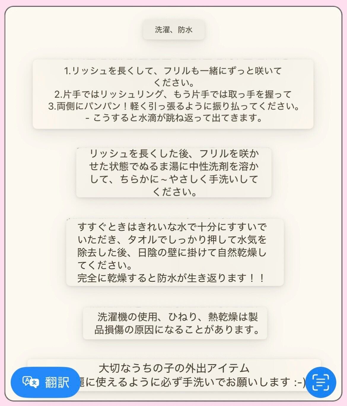 リッシュを長くした後、フリルをつけた状態でぬるま湯に中性洗剤を溶かし、やさしく手洗いしてください。