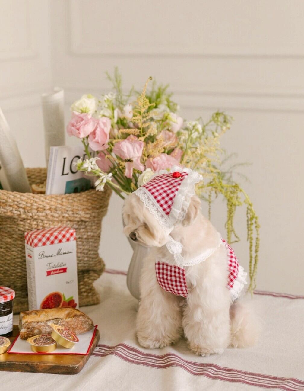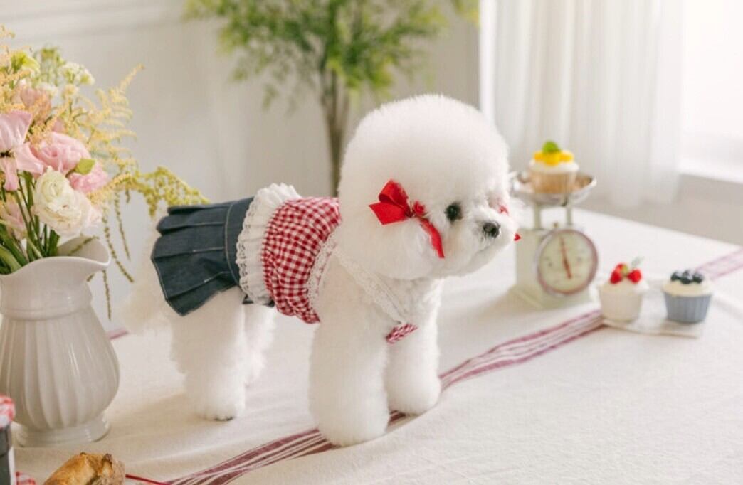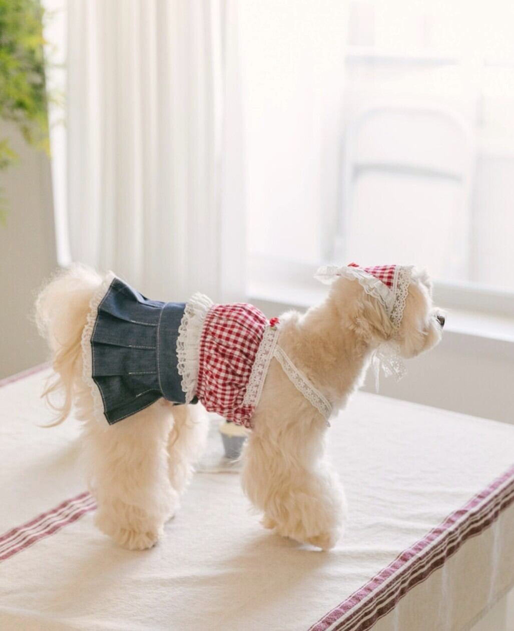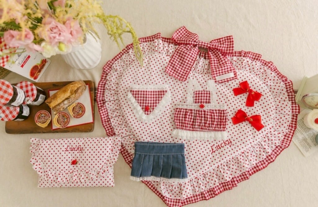 レッドギンガムチェック生地に繊細なレースと小さなバラの装飾をトッピングし、