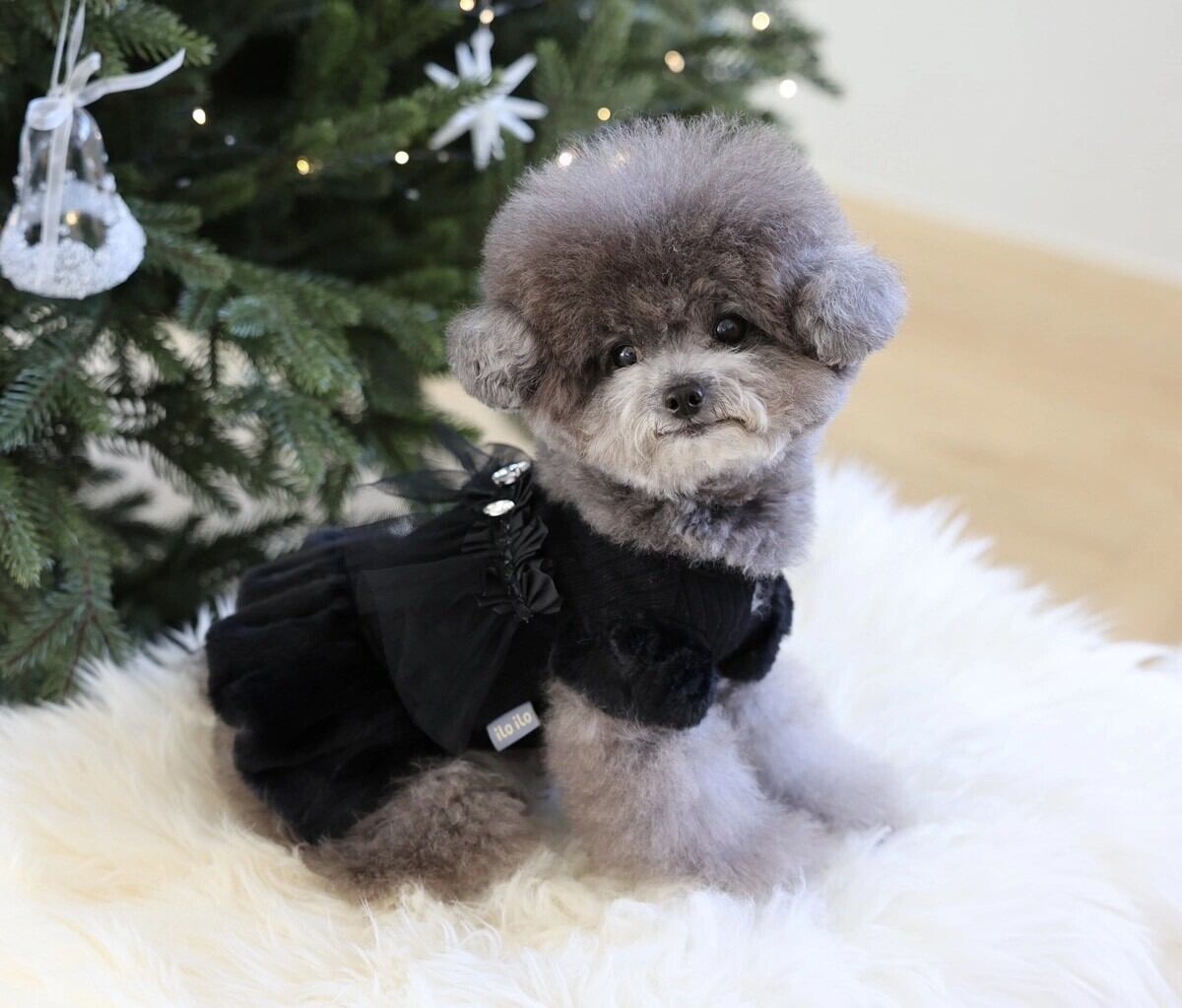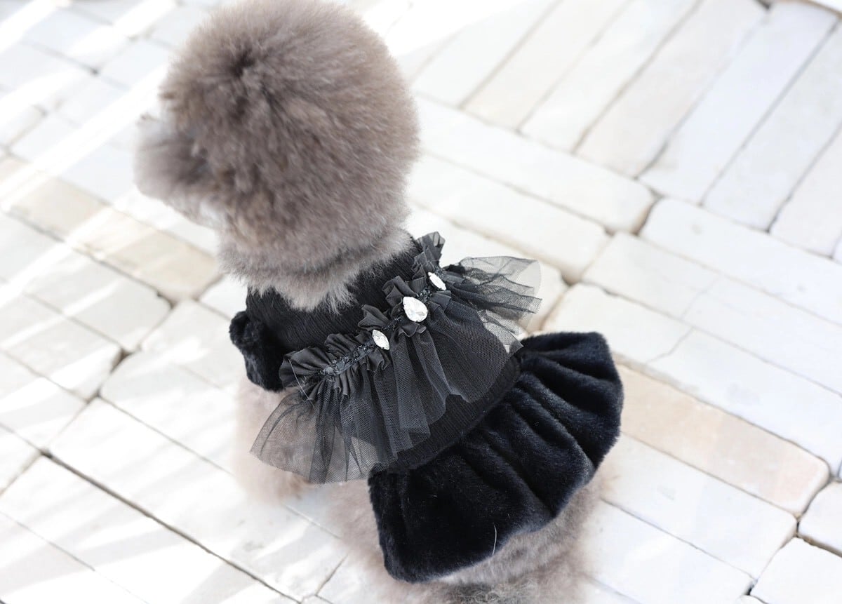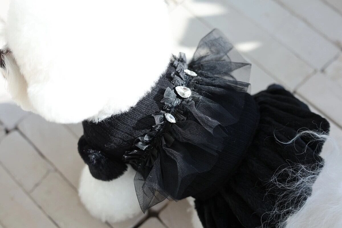 エレガントで光沢のある黒いレースに輝く宝石がきらめくようなワンピースです。