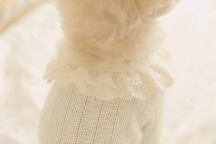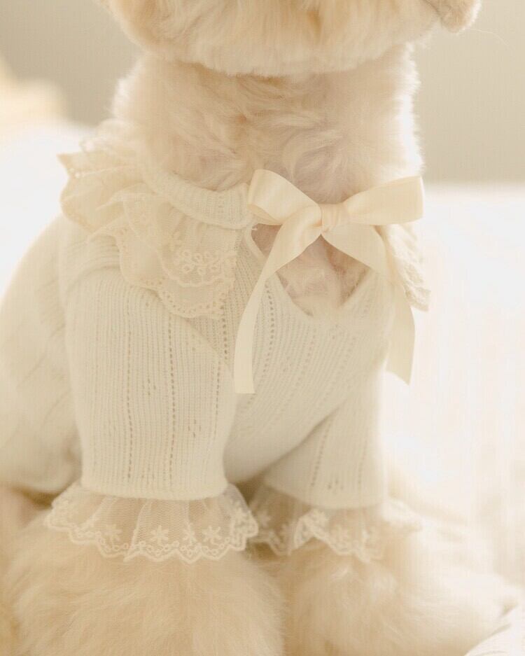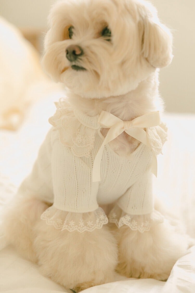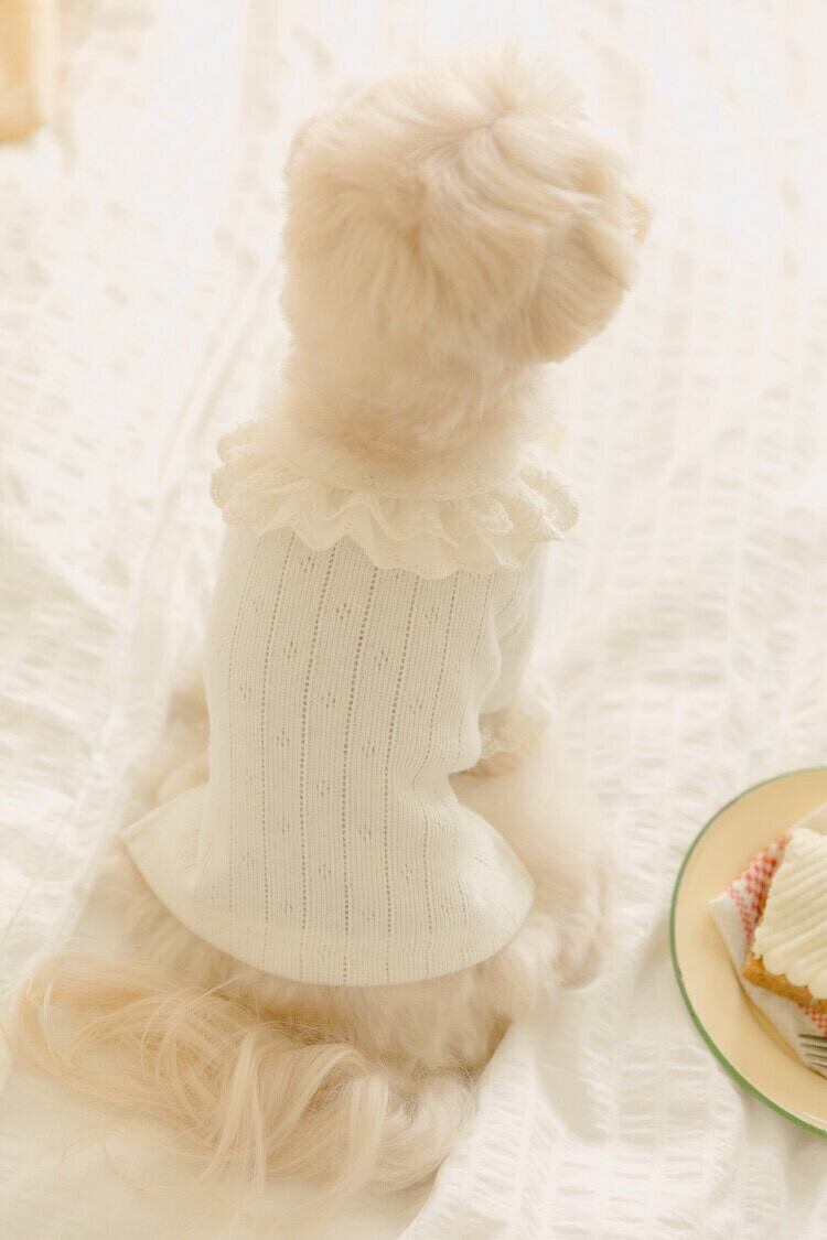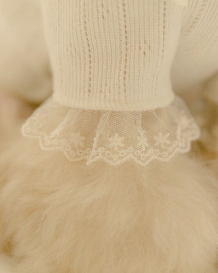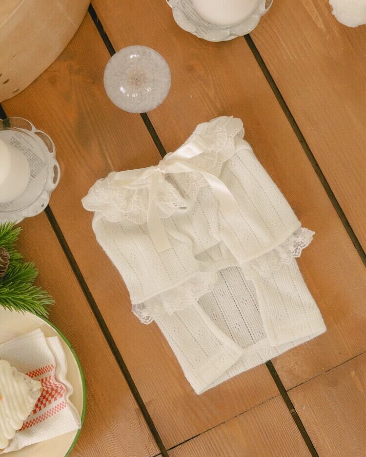 これはホリーコテージのレーストップで、落ち着いたアイレットニットにレースのフリルやリボンのディテールが施されています♡