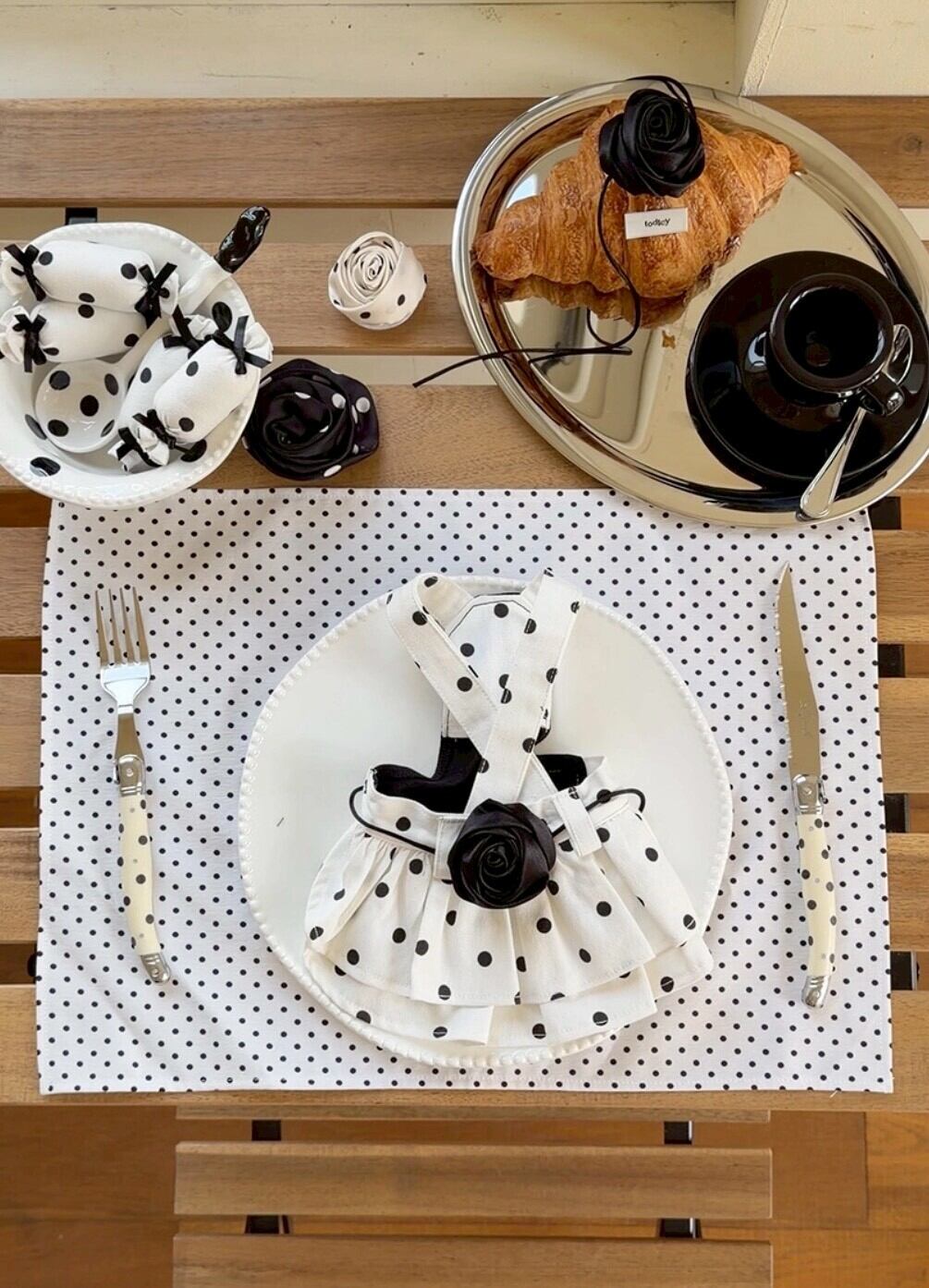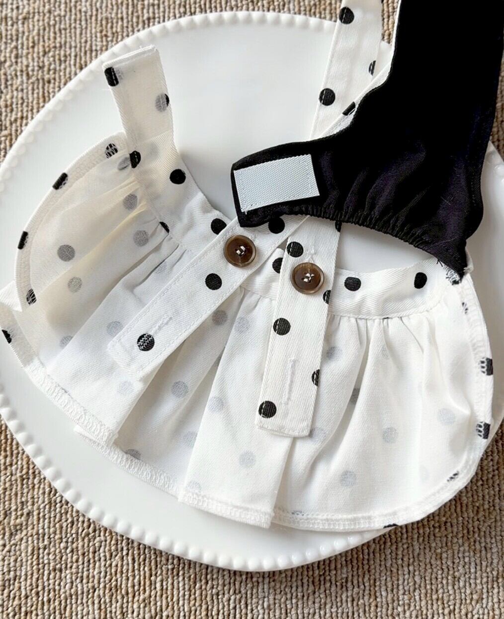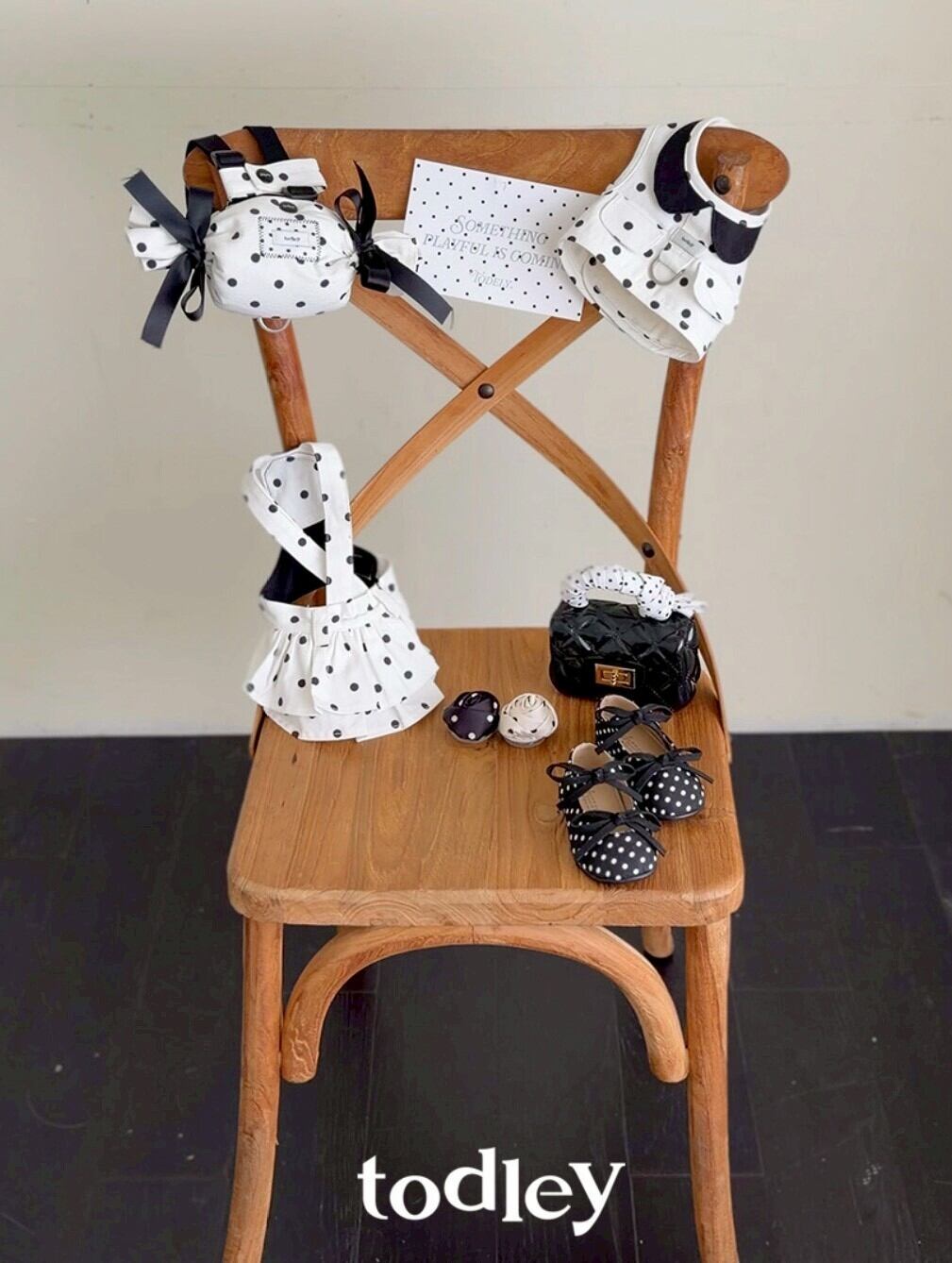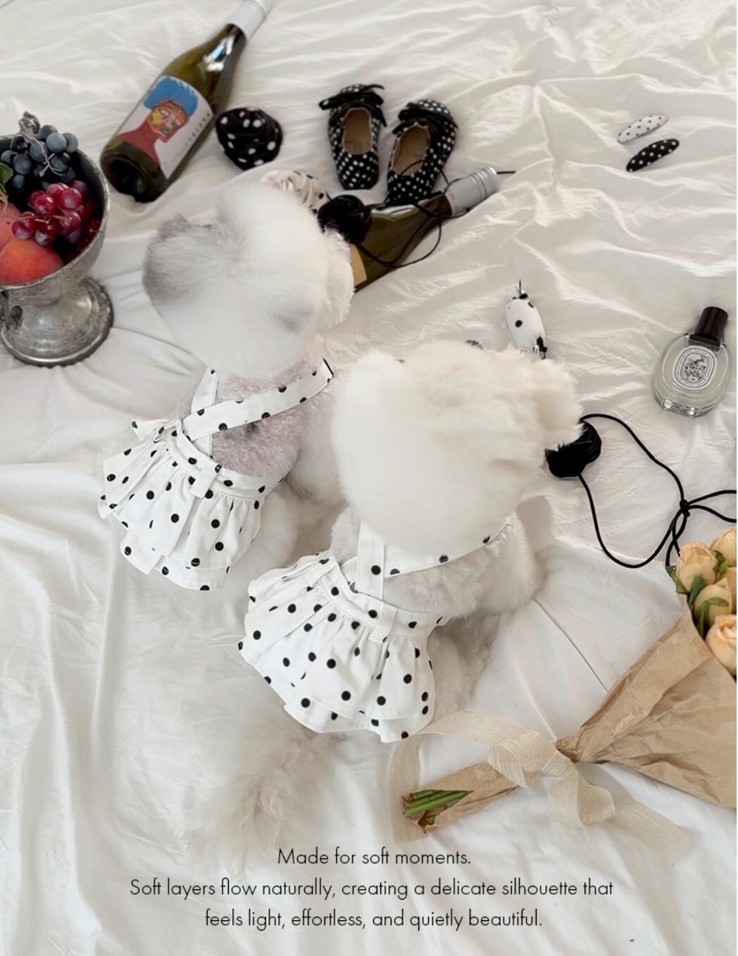 ふんわりと広がる2段フリルのシルエットとクラシックなドット柄で、これ1枚だけでも十分なアクセントに♡